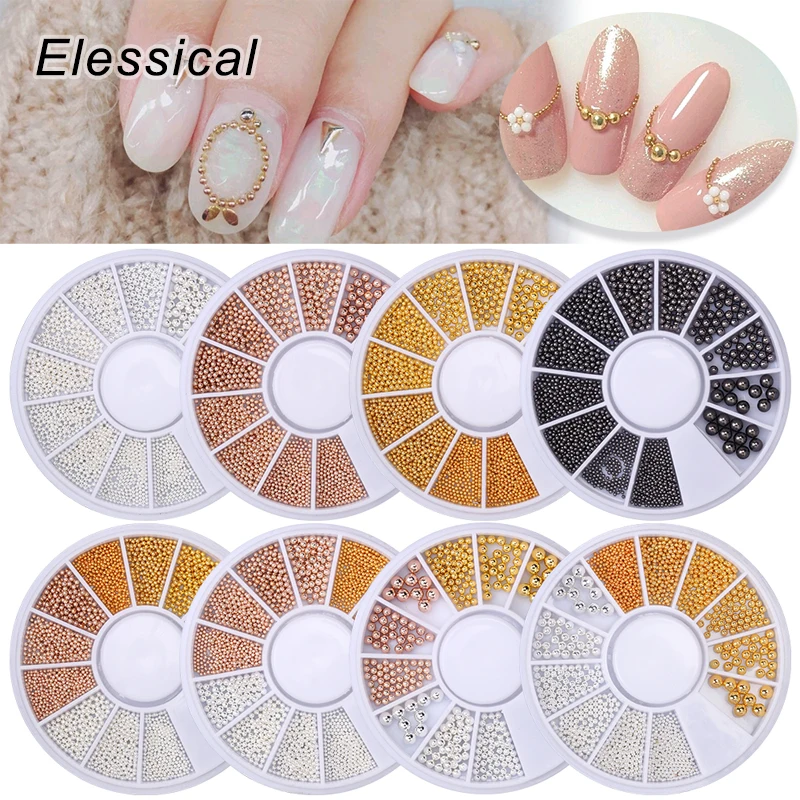 معرض من Elessical مسمار الفن صغيرة الصلب الكافيار الخرز مزيج حجم 3D تصميم مانيكير مجوهرات روز الذهب الفضة الأسود DIY الديكور عجلة