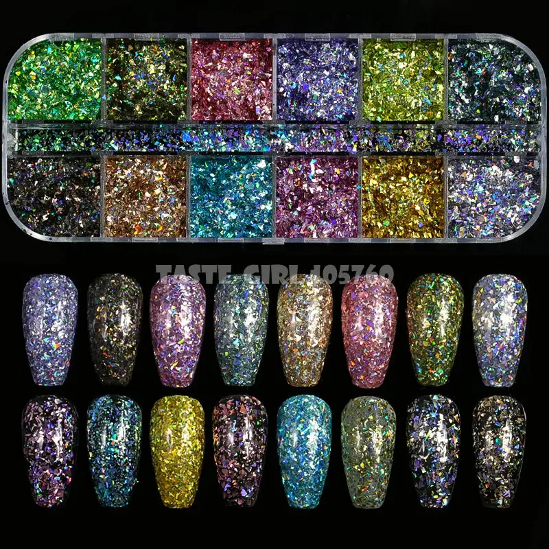 المنتجات ذات الصلة ل Nails Art و 12 شبكات/مجموعة عالية الجودة التصوير المجسم بريق غير النظامية جزء مسحوق أظافر تركيب من الأكريليك الديكور يمكن خلط مع هلام DIY CT25 #
